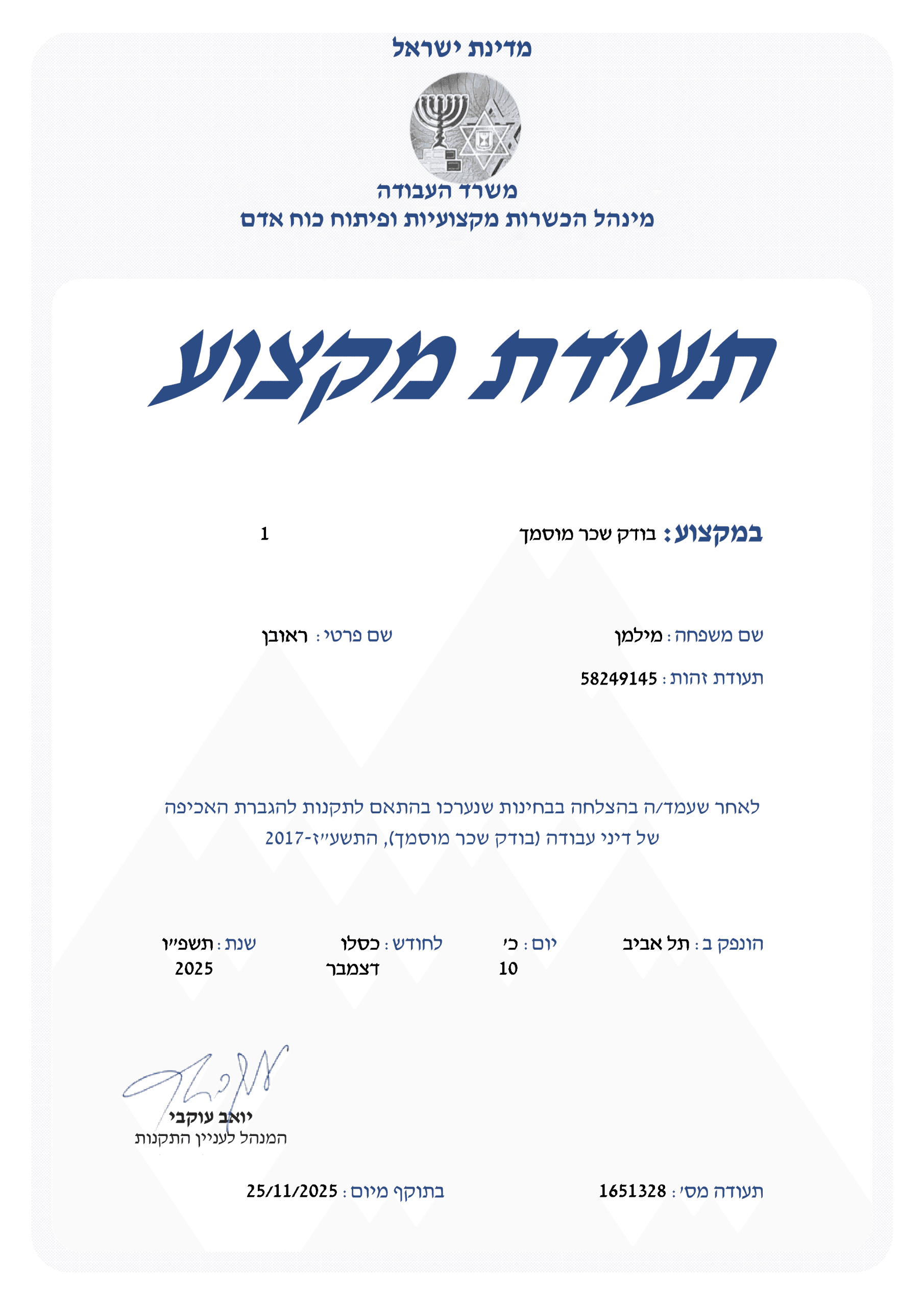 עו״ד מילמן בעל תואר שני במשפט פרטי ועסקי, בודק שכר מוסמך, בורר ומגשר, וכן מוסמך לעריכת ייפוי כוח מתמשך.